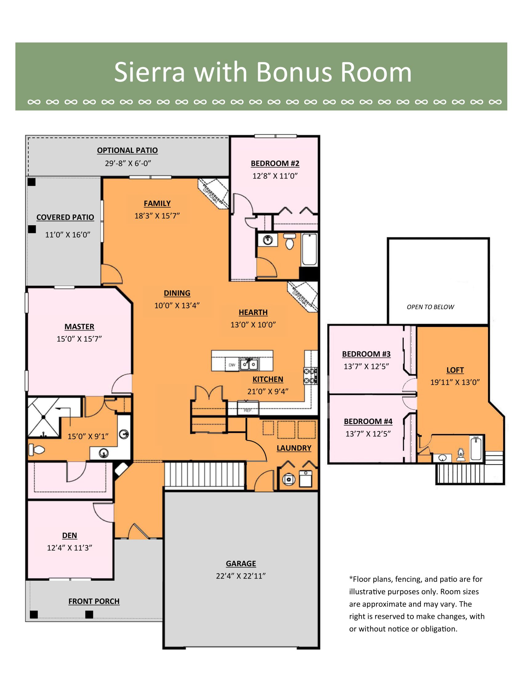 The Sierra’s open and airy concept is the central point of this unique home. Although spacious enough for gatherings, the living room and kitchen feel warm and intimate with the hearth room near-by. Relax in your grand owner’s suite with a walk-in closet and walk-in spa shower. Enjoy your guest suite separated for privacy. Appreciate the versatile den. Wind down on your covered patio or in your outdoor living space. If more room is what you’re after, consider converting the covered patio to a 4-season room, or choose our optional second story with two full bedrooms, a full bath and a spacious loft. The Sierra’s exceptional attention to detail makes this home stand above the rest.