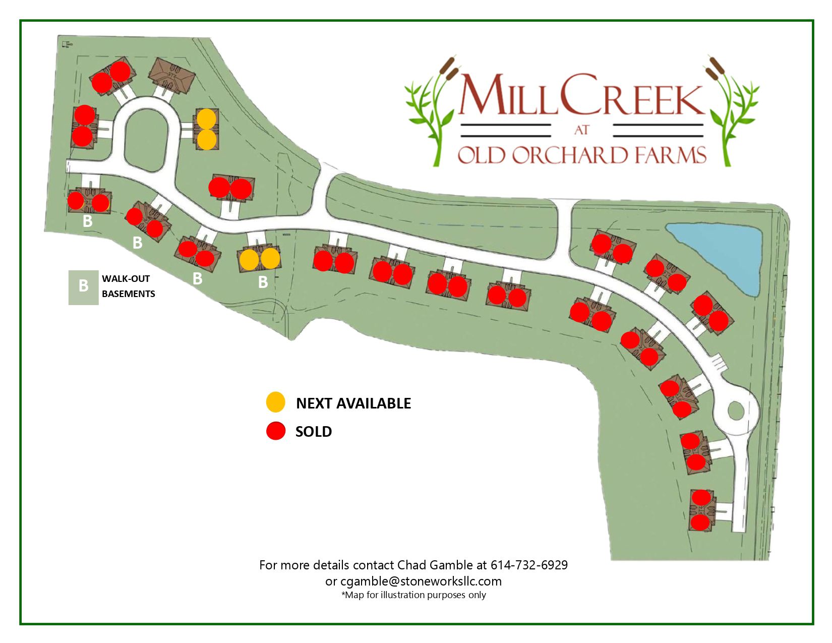 Mill Creek at Olde Orchard Farms, located in Newark OH, is ranch style condominium living at its best! This community is a private retreat that offers city conveniences nestled in a peaceful setting. Homeowners will enjoy mature trees, a beautiful pond, and a winding creek on the south side of the community… but still be close to shopping, restaurants, recreational activities, medical facilities, and more!